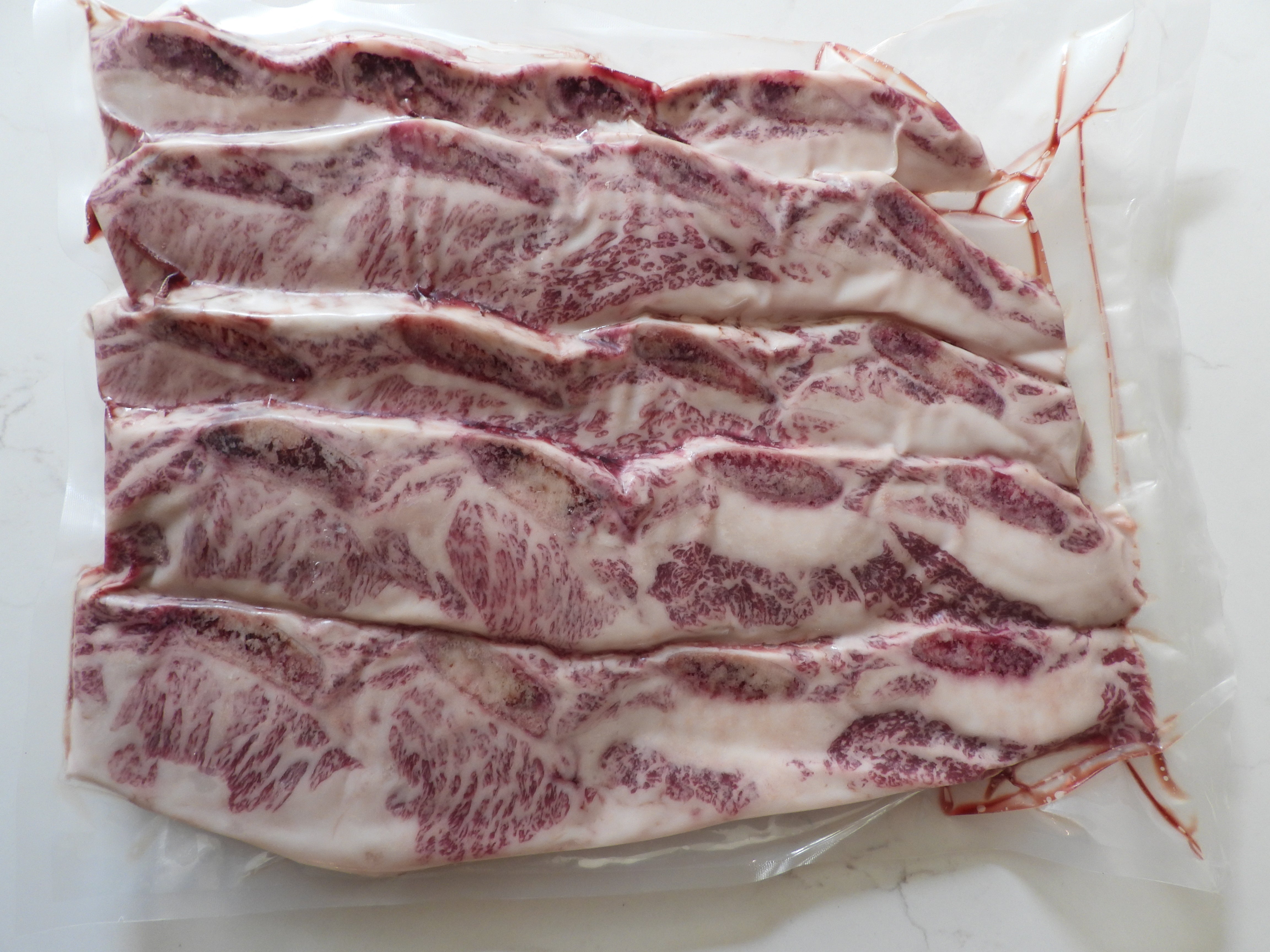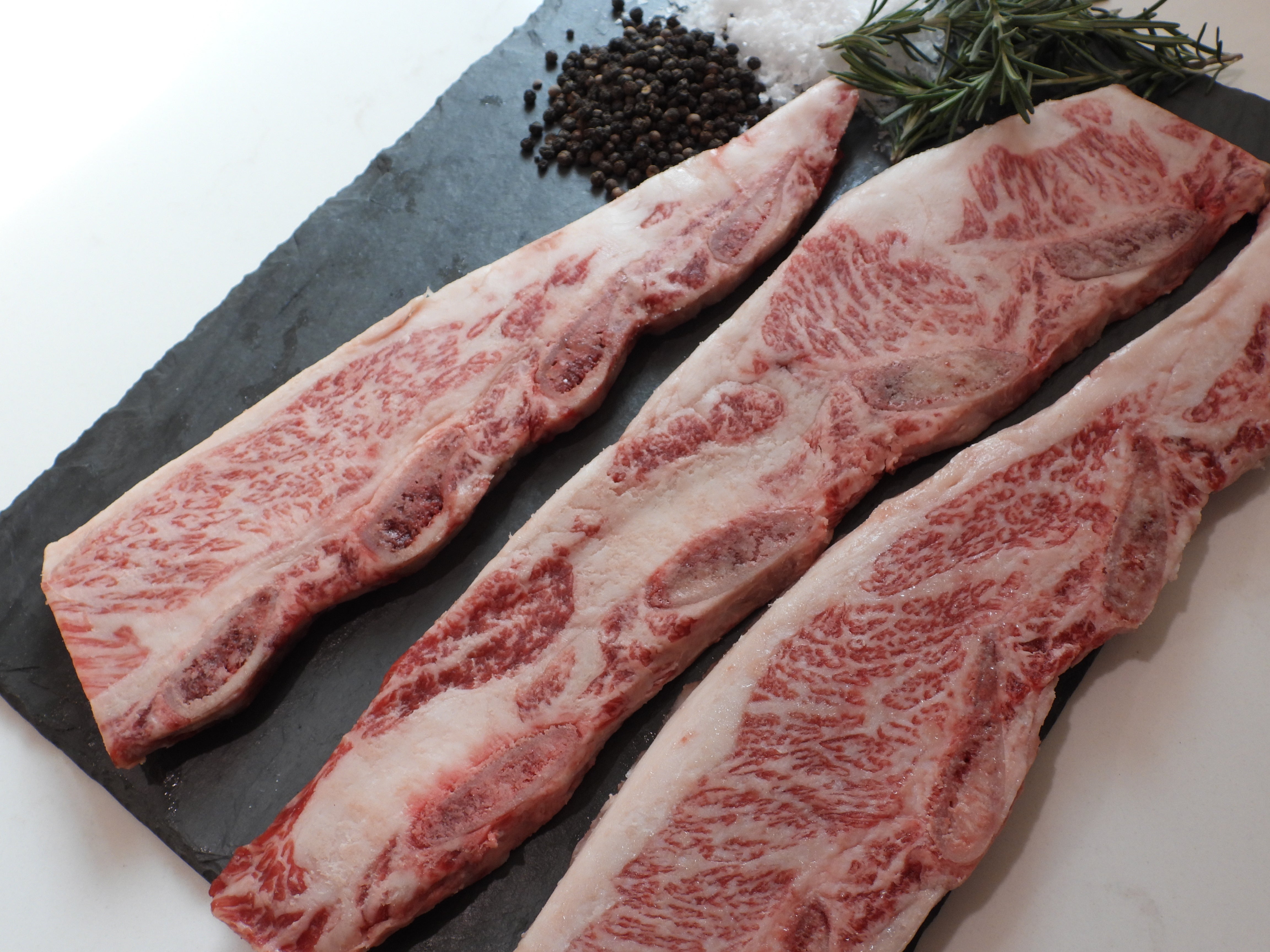 Wagyu Flanken Ribs are cross-cut short ribs that showcase the marbling and tenderness of premium beef. Sliced thin across the bone, they cook quickly over high heat—ideal for grilling, broiling, or pan-searing. The bone-in presentation adds flavor and visual appeal, while the intramuscular fat renders beautifully, creating a rich, buttery bite. Perfect for Korean BBQ, yakitori, or any high-heat preparation that highlights the meat's natural complexity. Approximately 1.7–2.2 lbs. per package.